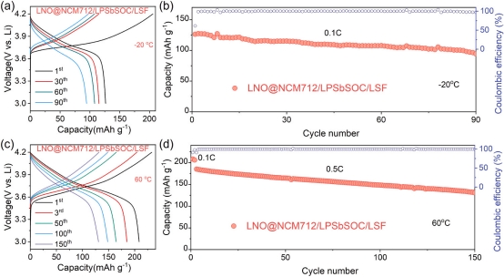 基于此,西安电子科技大学李思吾副教授与华中科技大学杨辉教授、余创教授合作,创新性地提出“复合阳极+功能电解质”的双重保护策略,构建了具有高锂亲和力与高界面能的Janus界面。一方面,作者通过熔融锂金属与SnF₂反应,形成由Li、Li₂₂Sn₅合金和LiF组成的复合结构。其中,Li₂₂Sn₅合金构建快速电子/离子传导网络,优化锂离子体相扩散;LiF凭借高界面能延缓锂枝晶生长,起到“疏通”锂离子分布的作用。另一方面,作者在Li₅.₅PS₄.₅Cl₁.₅硫化物电解质中引入Sb和O元素,使其与锂金属接触时原位生成Li-Sb合金界面。该界面不仅加速锂离子迁移,还能在高电流密度下主动消耗穿透的锂枝晶,形成稳定阻挡层,发挥“阻断”功能。实验结果显示,采用双重修饰策略的对称电池在0.5 mA/cm²下稳定循环1400小时,过电位仅从10 mV缓慢增至29 mV;临界电流密度(CCD)高达5.2 mA/cm²,远超单一修饰策略(1.8-3.5 mA/cm²)。全电池测试中,基于LiNi₀.₇Co₀.₁Mn₀.₂O₂正极的ASSLMB在0.5C倍率下循环700次后容量保持率达70%,且在-20°C至60°C宽温域内表现优异,高温(60°C)循环150次容量保持90%,低温(-20°C)循环90次仍保有80%容量。